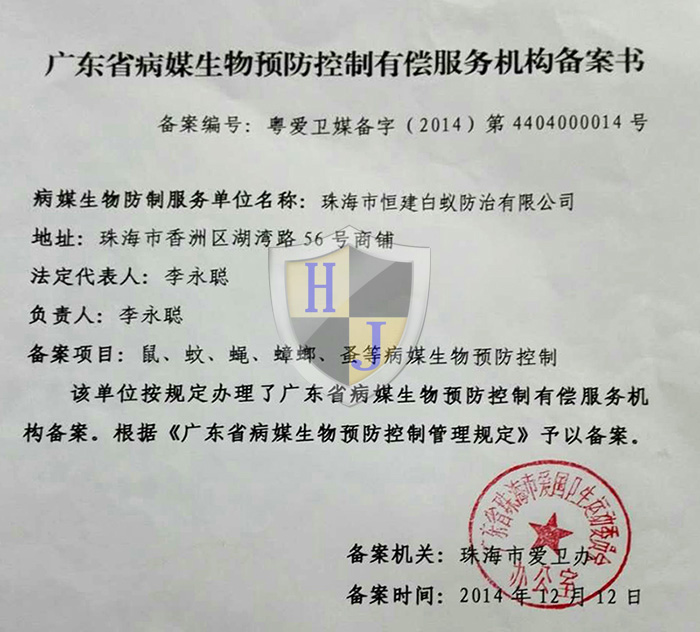 珠海市恒建白蟻防治有限公司成立于2005年10月,注冊資金人民幣300萬元,本地老牌公司。本公司專注于白蟻防治、滅鼠、殺蟲、疫情消毒防控、防蛇、其它有害生物病媒控制和預(yù)防管理等。